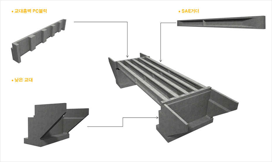 교대 흉벽 PC블럭을 이용하여 무조인트 교량의 가장 큰 단점인 교대 흉벽과 거더 연결부인 현장 타설구간의 시공성 및 거더형식 적용성을 개선한 새로운 타입의 무조인트 교량